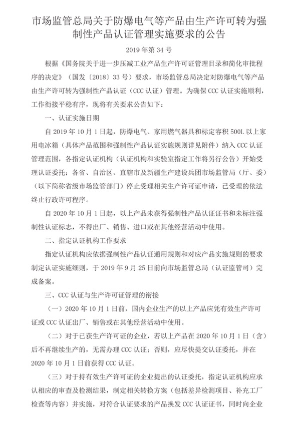 您当前的位置 : 首 页 > 防爆认证 > 2019年第34号 防爆电气由生产许可转CCC认证实施公告